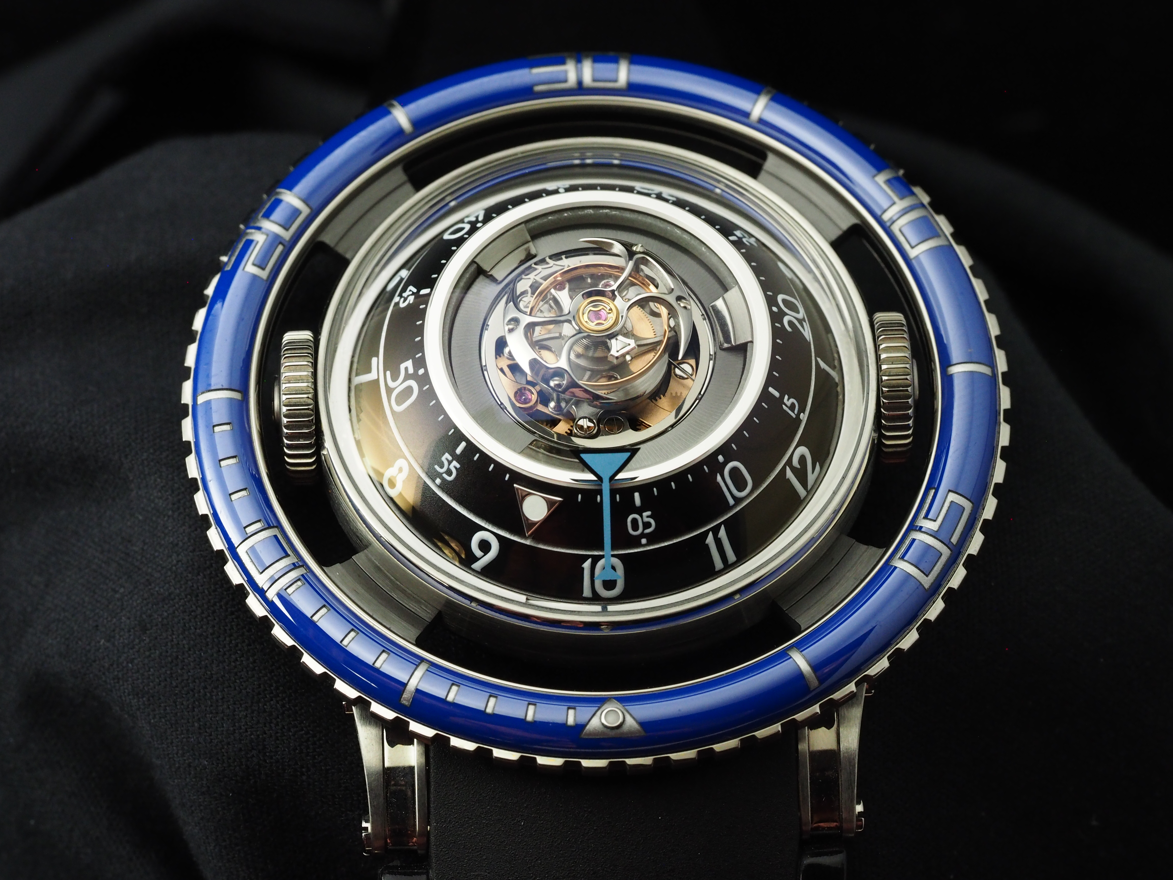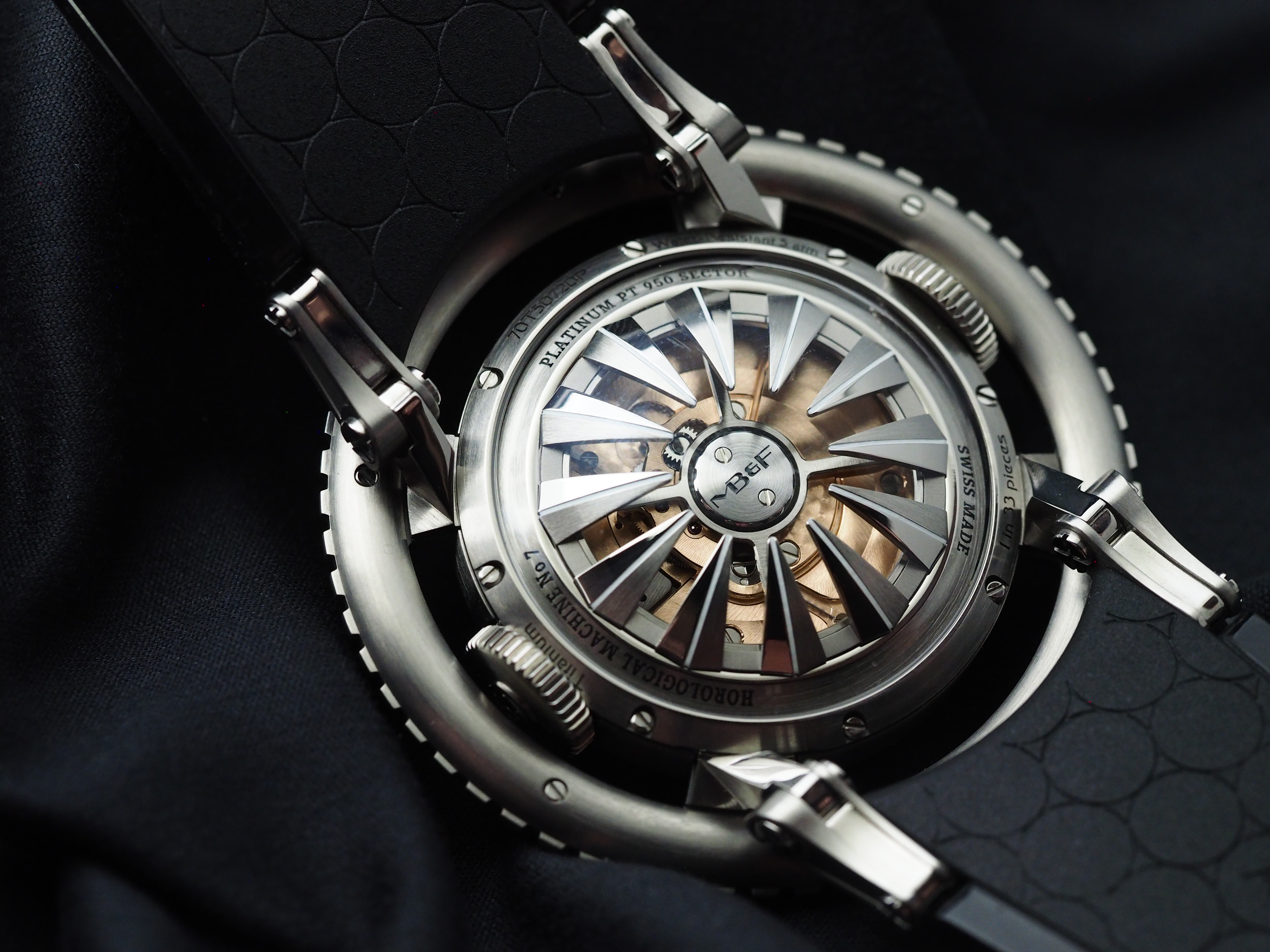 The first thing you notice about the HM7 Aquapod is its size. At almost 54mm across and over 21mm tall, the watch could quite easily sit in a stand atop a desk like one of MB&F’s Co-creations with L’Epée 1839. A large, unblinking eye sits in the centre of the machine, surrounded by a transparent membrane housed within a concentric ring. This eye is a 60 second flying tourbillon – the same tourbillon that was used in the HM6 Space Pirate. But in the Aquapod, the movement architecture has been rotated, so that the “engine” of the horological machine is oriented vertically, rather than horizontally, giving the Aquapod a fanciful, almost clock-like feel.