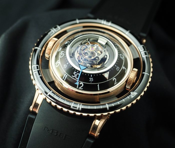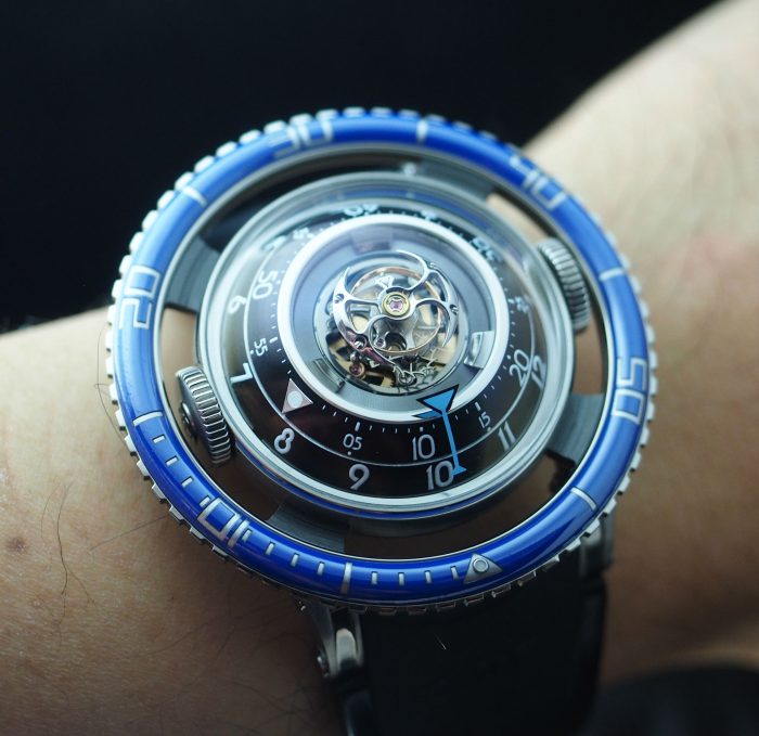 Sticking to its marine-inspired roots, the watch is wound and set by two separate, oversized crowns – ideal if you’re wearing gloves. A large, rubber ring-like ceramic bezel surrounds the watch, attached to the body of the watch at each of the hinged lugs. The semi-toric profile is unusual and rather lovely – and it’ll even work as a dive timer (although MB&F staff were at pains to point out that the 50m WR-rated Aquapod is not a diver’s watch). Time is read from the two rotating minute and hour rings – as with the Arachnophobia and Starfleet Machines. A helpful triangle pip acts as a 60 minute marker; aligning the corresponding bezel pip with with minute marker allows elapsed time to be read.