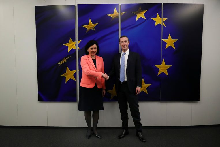 Mark Zuckerberg en lid van Europese Commissie Vera Jourova in Brussel.Beeld AP