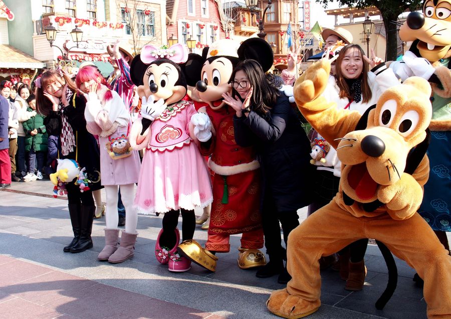 21 января 2019 года, туристы фотографируются с персонажами Уолта Диснея в тематическом парке Диснейленд в Шанхае. /Фото: Синьхуа/