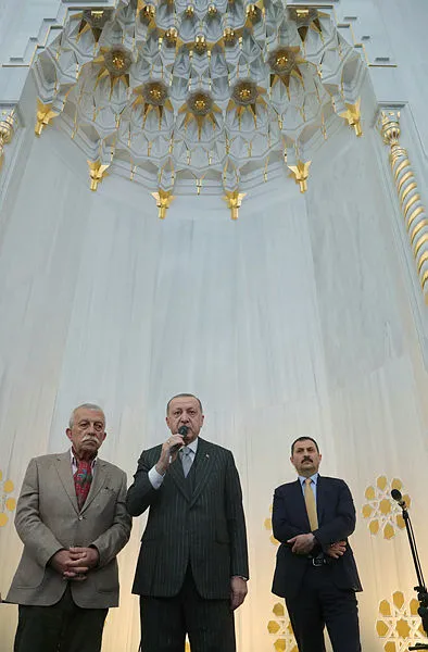 «Şu Çamlıca cami gerçekten bu asrın en önemli bir mührü» diyen Başkan Erdoğan, «Bunun arkasından da inşallah Levent’te başlayan bir camimiz var. Öyle zannediyorum ki 2-3 yılda bitecek. 20 bin kişi alacak bir cami Levent’te Büyükdere Caddesi’nde yapılıyor. Orayı da süratle bitirip memleketimiz tüm müslümanların hizmetine sunacağız. Malum dünyada bir korona virüs salgını var. Bu salgın nedeniyle öpüşme tokalaşma çok önemli bir münasebettir. Bu aralar bu sarılmaları öpüşmeleri erteleyelim. Bunu da ben sizden istirham etmiş olayım. Bir şeyi yapalım derken diğerini kaybetmeyelim. Önemli olan gönlümüzden, kalbimizden geçendir» şeklinde konuştu.
