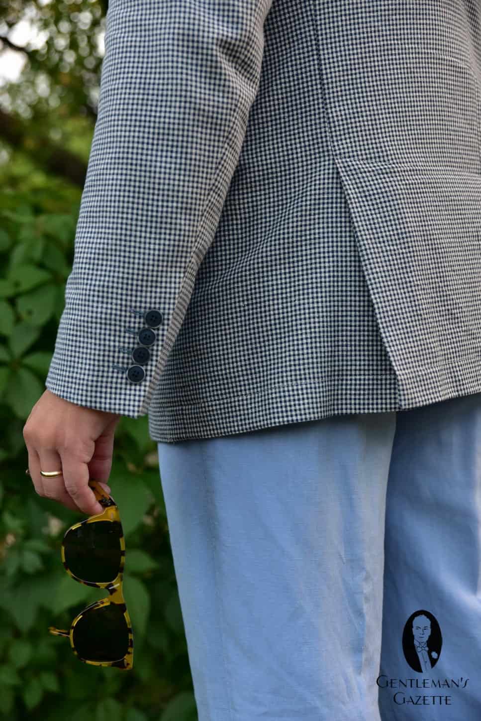This is one instance where a higher-end tailoring detail is actually detrimental to alterations, so if you pick up a jacket with functioning sleeve buttons, make sure the sleeves don’t need extensive lengthening or shortening. In fact, even cleaning up the stitching on non-functional sleeves can be imperfect, so exercise caution. An alternative is to have a skilled tailor shorten the sleeve by removing it and reducing it at the shoulder rather than at the bottom. Lengthening can also be done at the shoulder depending on whether there is an extra fabric available. Both are more expensive.
