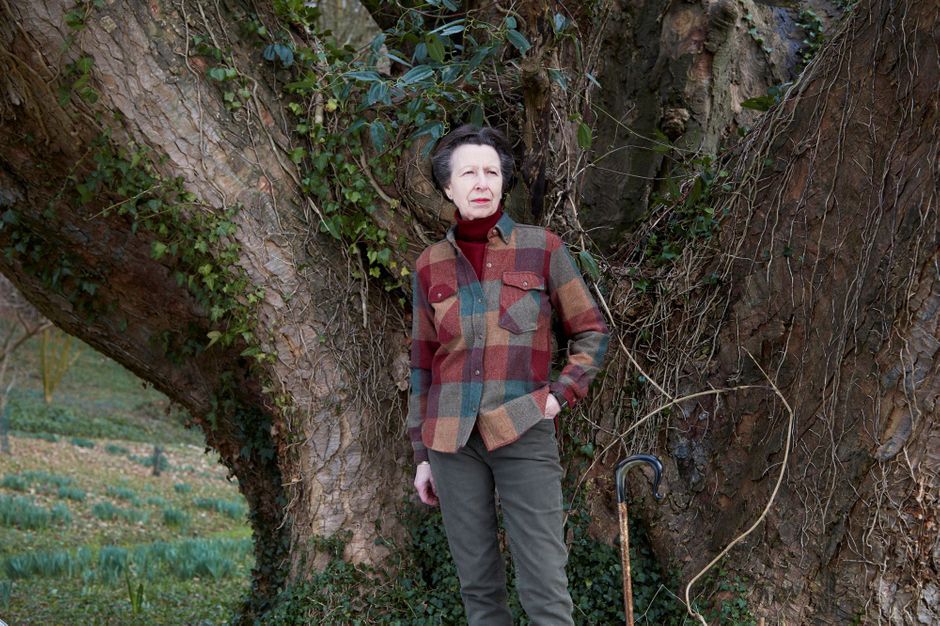 Un look à cent lieues de celui dans lequel elle s'affiche sur la troisième image, réalisée cette fois dehors. On y découvre la mère de Peter et Zara Phillips, prenant la pose devant l'impressionnant tronc d'un arbre vénérable, le regard perdu vers l'horizon. Elle est en tenue de campagne: pull-over à col roulé grenat, pantalon vert kaki et chemise à carreaux associant ces deux tons au caramel.